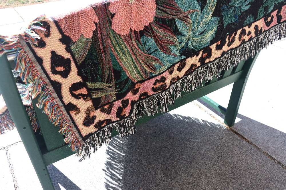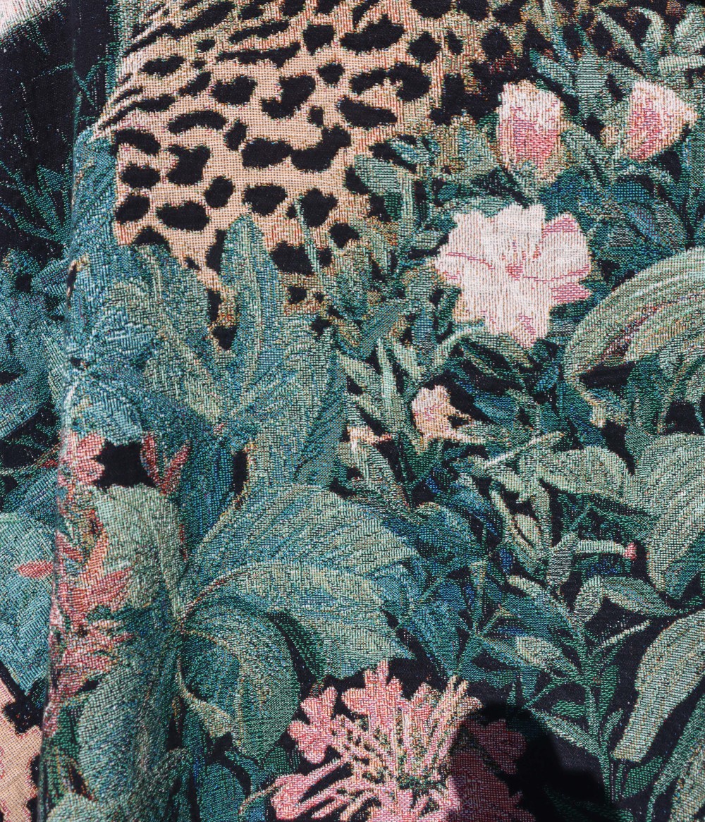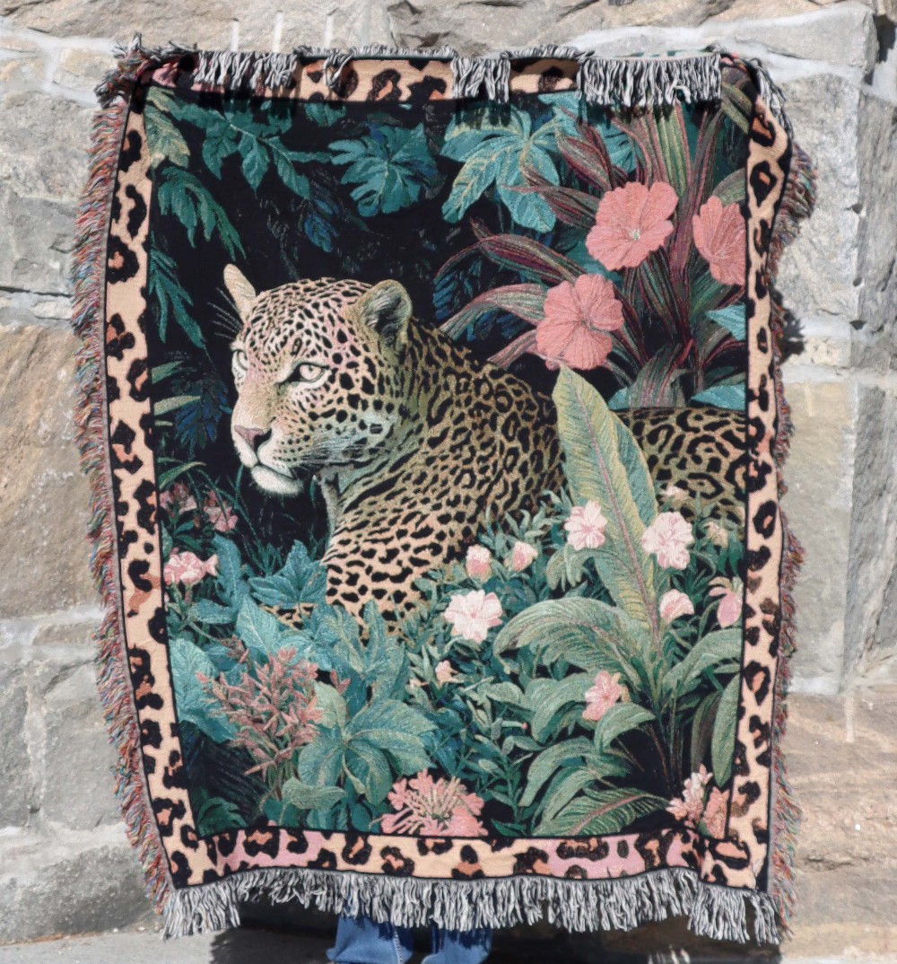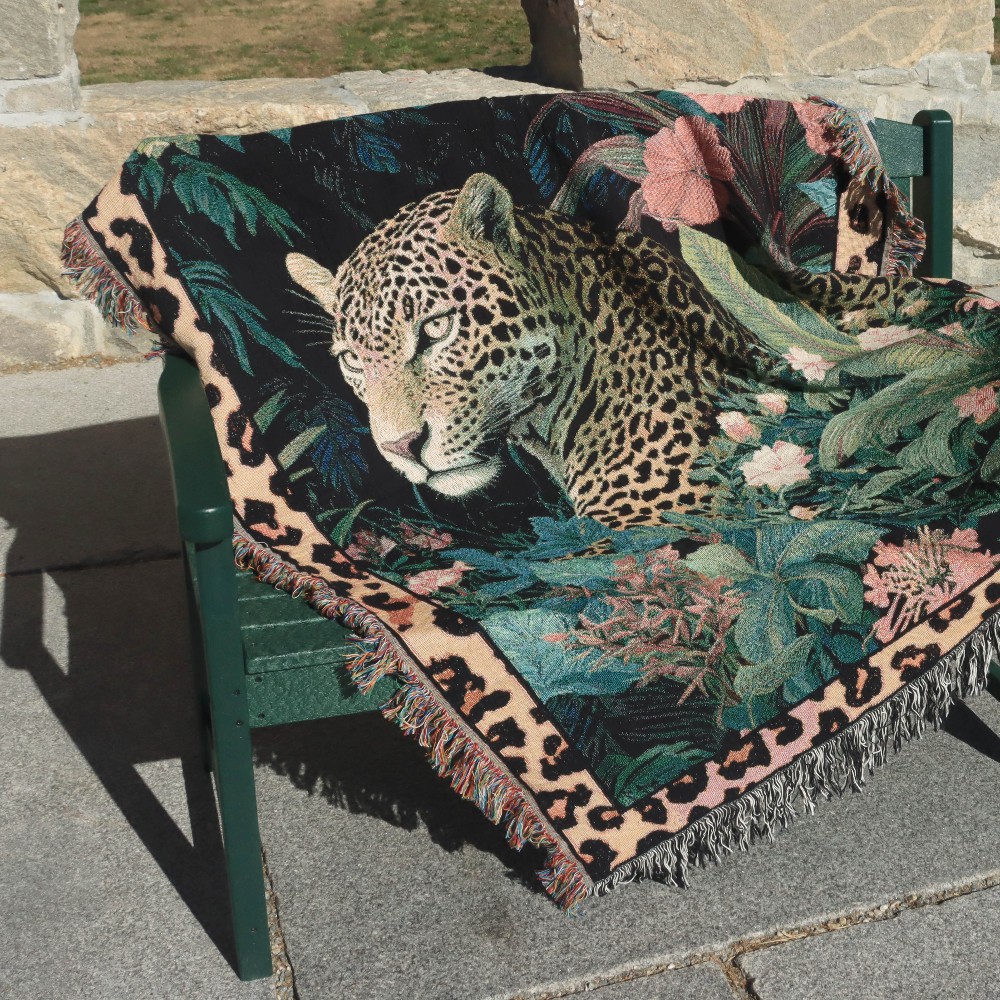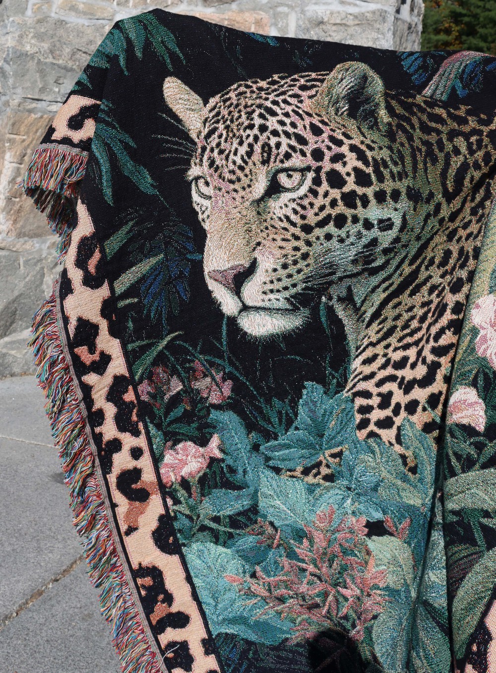 A 100% Cotton Woven Throw Blanket with a beautifully woven artwork of a leopard reclining in a Floral jungle Paradise.