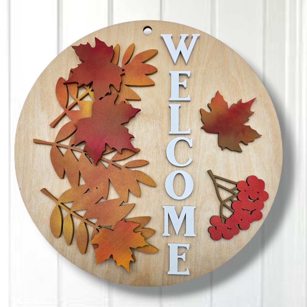 Embrace the beauty of autumn with our Welcome Fall Leaves Door Hanger! Measuring approximately 16 inches round, this stunning piece is crafted from three layers of 1/4 inch Baltic birch, ensuring both durability and a visually captivating 3D effect. The vibrant fall-colored leaves add a seasonal touch, making it the perfect addition to your home’s fall décor.