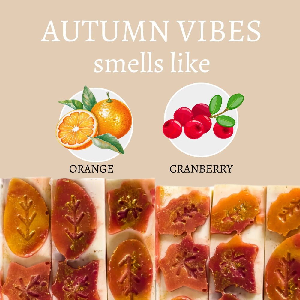 This quintessential fall soap is topped with the tiniest most adorable fall foliage. Each leaf (red, yellow, and orange) is hand-dusted with a touch of gold. We think it gives it that little something extra...