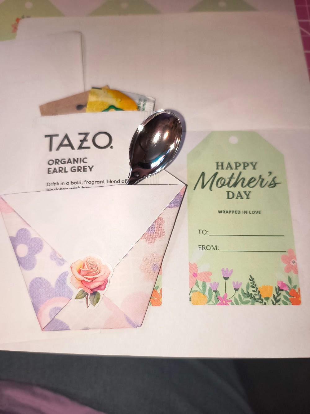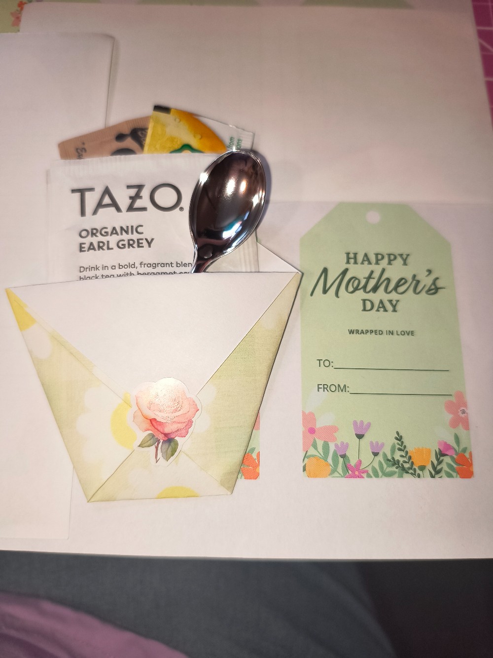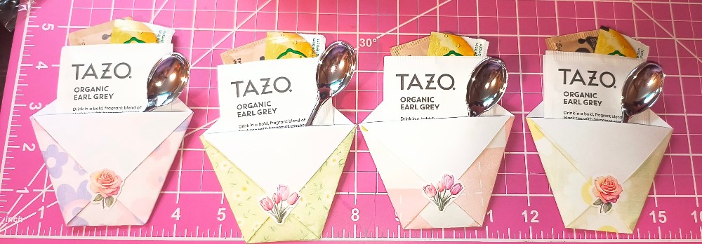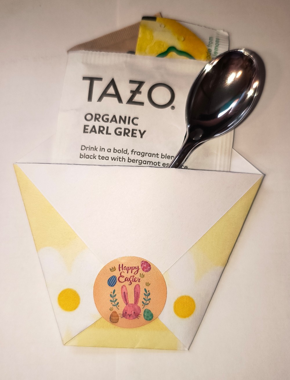 Tea bag, honey granules, lemon, and spoon wrapped in a cute pocket for gifting ( pocket paper styles vary - but a same color variety can be requested and ordered